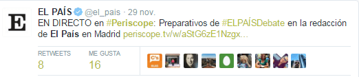 El periódico El País, también se unió a Periscope. Hace menos de un mes, ofreció a sus seguidores una mirada al interior de la redacción para mostrar los preparativos del debate.