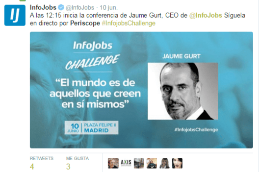 El popular portal de empleo, Infojobs, se lanzó hace varios meses a usar Periscope para transmitir en directo tanto ofertas de empleo como conferencias.