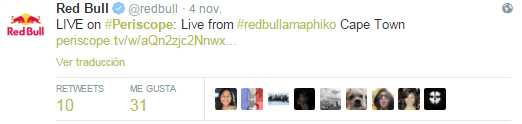 La bebida energética también experimentó con Periscope para retransmitir en directo sus eventos y así lo sigue haciendo a día de hoy.