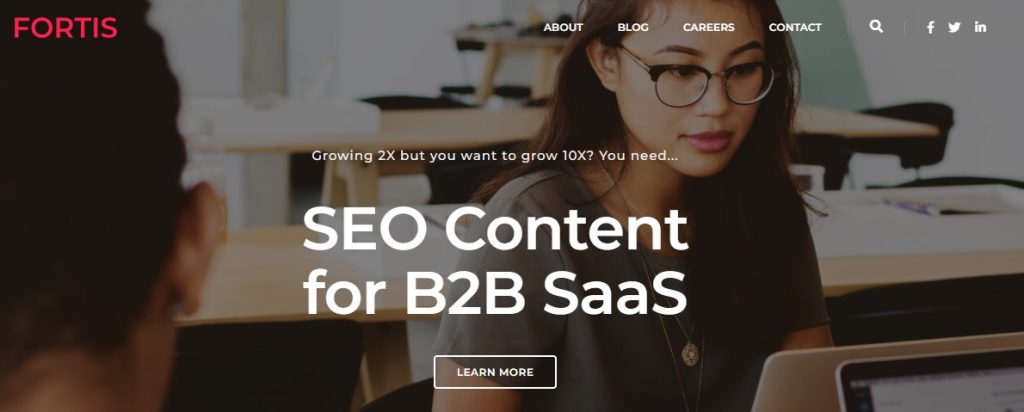 Mientras que Fortis no proporciona los servicios típicos de SEO como auditorías de sitios y SEO en la página, están muy enfocados en ser la mejor agencia de marketing de contenidos para empresas de SaaS.