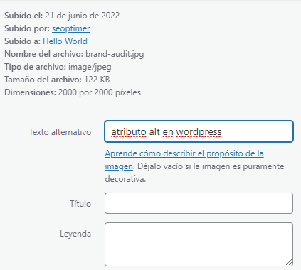 Otra manera de hacerlo consiste en ir hasta la Biblioteca de Medios, hacer clic en la imagen respectiva e incluir el texto en el cuadro Texto alternativo.