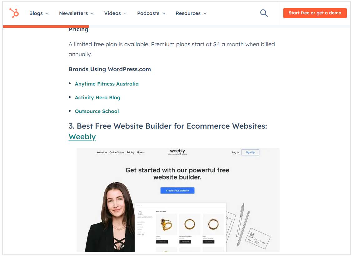 Por ejemplo, en la captura de pantalla a continuación, puedes ver a HubSpot enlazando a Weebly.com, un constructor de sitios web, en una de sus publicaciones de blog.