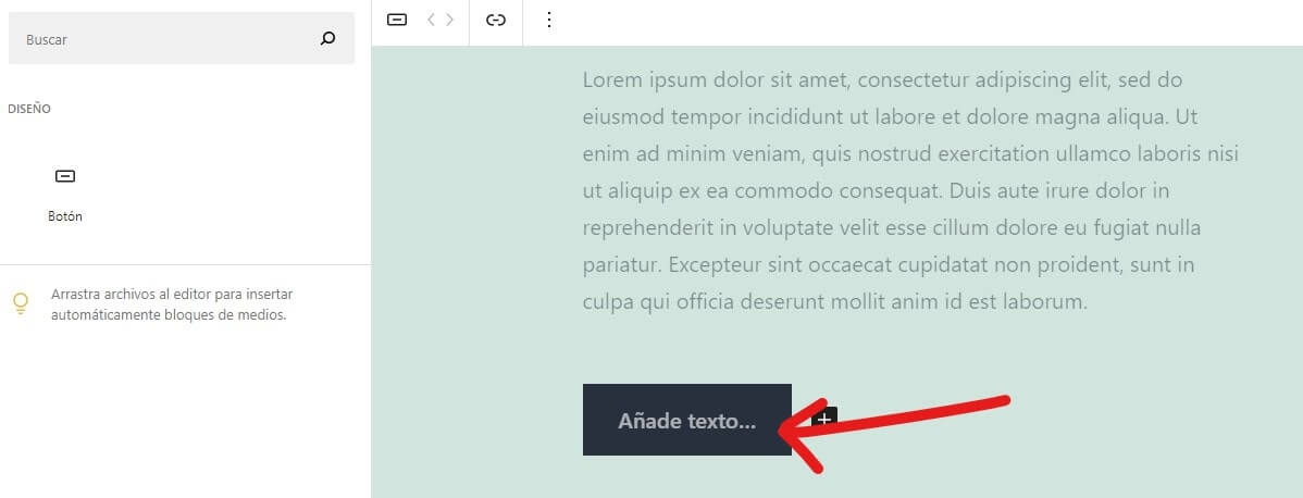 - Debajo de los elementos de diseño, selecciona el bloque de botón como se muestra en la siguiente imagen: