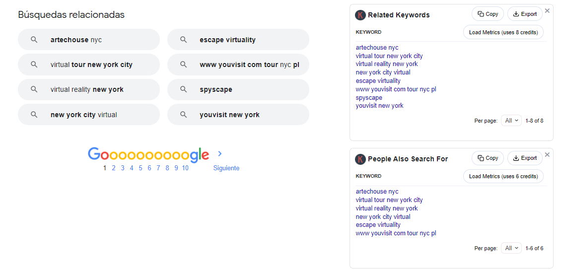 Veamos otro ejemplo para comprender cómo los motores de búsqueda intentan ayudar al usuario. Imagínate que tienes una sala de juegos de realidad virtual en New York y quieres conocer la intención de tu público objetivo para crear contenido relevante. Una vez que incluyas la palabra clave “sala de juegos de realidad virtual en New York”, los resultados de búsqueda relacionados son: