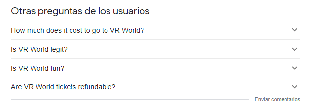 Cuando comparamos las búsquedas relacionadas con las páginas web en los resultados de búsqueda, el contenido se centra en la mejor sala de juegos de realidad virtual. Esto significa que las preguntas que hacen los usuarios podrían ser: “¿cuáles son las mejores salas de juegos de realidad virtual en New York?” “¿Cuáles son las mejores salas de juegos de realidad virtual cerca de mí?”. Si se escriben estas preguntas, Google también puede ofrecer preguntas como: “Los usuarios también preguntan”, con las que puedes generar ideas y responder estas preguntas: