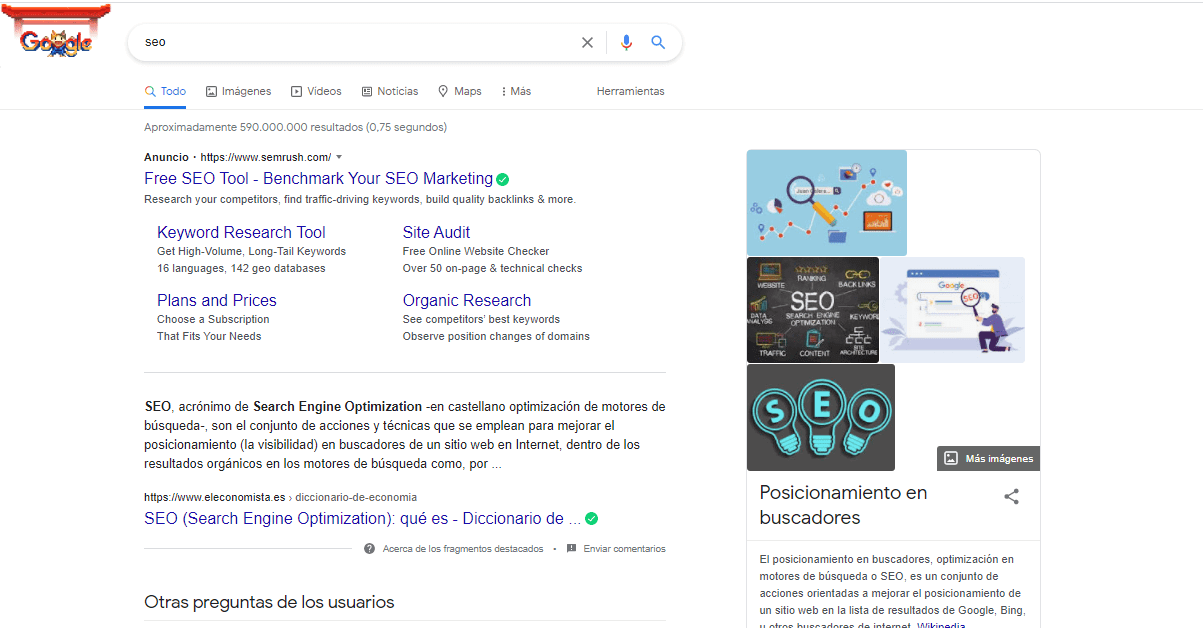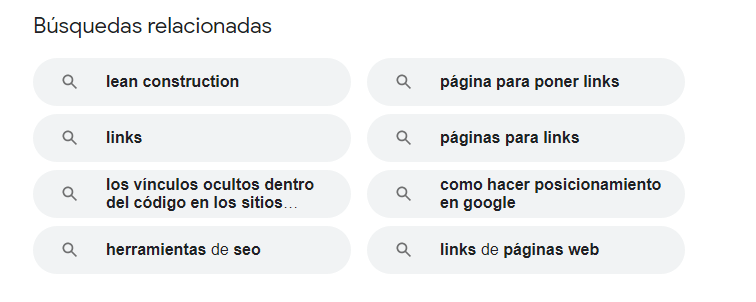 Estas búsquedas relacionadas con SEO ayudan a los usuarios a encontrar la respuesta correcta que quizás no pensaron antes. ¿Buscas tutoriales? ¿Conoces los diferentes tipos de SEO? ¿Buscas servicios o herramientas? Las búsquedas relacionadas te ayudan a definir tu consulta para que puedas recibir la mejor respuesta posible.