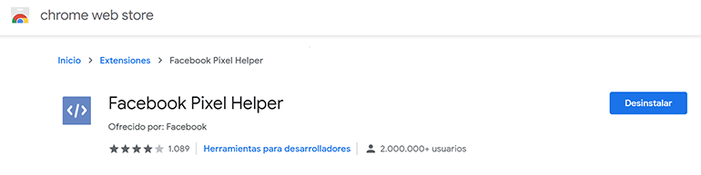 Revisa que el píxel está instalado y funciona correctamente en la página web usando la extensión gratis de Facebook, Facebook Pixel Helper:
