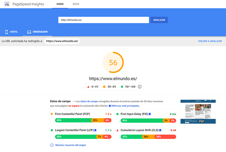 La velocidad de subida de la página web es un factor importante en la clasificación de búsqueda. Por lo que es fundamental llevar a cabo pruebas de velocidad del sitio y garantizar que las páginas clave se cargan adecuadamente. Google ha escrito mucho sobre este tema. Una velocidad lenta para la página también afecta de manera negativa la experiencia del usuario y, como resultado, ofrece un menor número de tráfico cuando los usuarios siguen enlaces de fuentes de referencia.