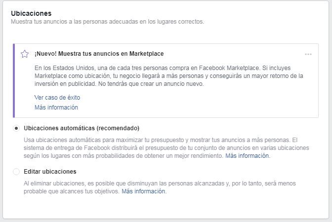 Aquí, sobre todo si tienes un ecommerce, es muy interesante la nueva opción de incluir tus anuncios en el Marketplace de Facebook.