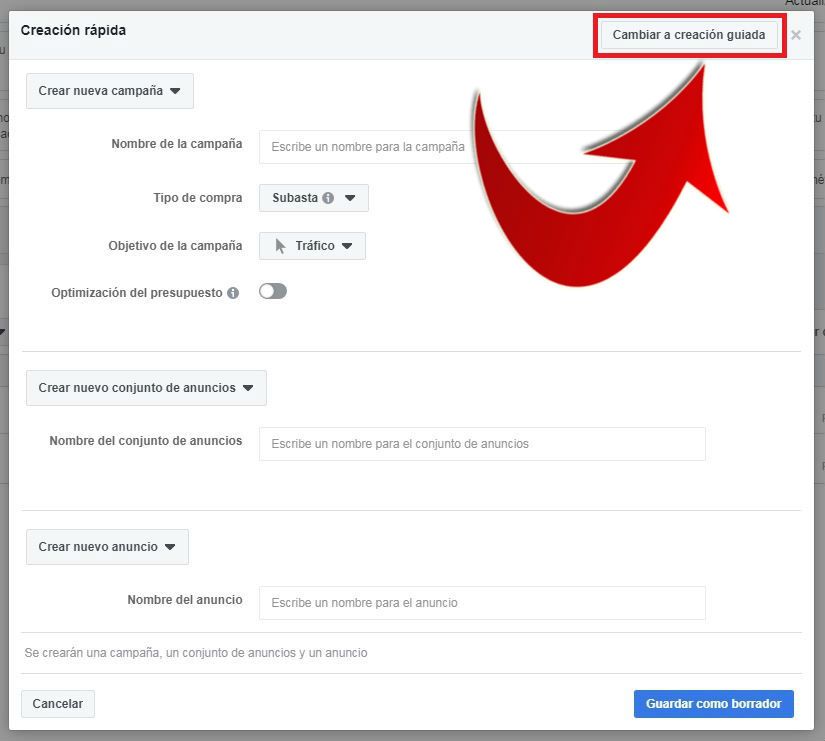 Bien, pues lo primero es darle a +CREAR ANUNCIO. Si te sale una pantalla como esta, te recomiendo que vayas siempre a la ayuda guiada. Así para tus primeros anuncios podrás configurar todo al detalle. Esta pantalla es para la creación rápida, y no podrás ver todas las opciones.