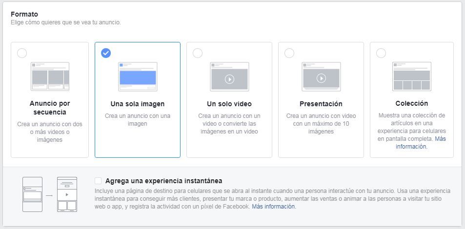 Una vez seleccionada toda la configuración, llega la hora de la creatividad. El último paso es donde tenemos que incluir nuestras imágenes y los textos que las acompañan. Estos son los formatos que podemos elegir.