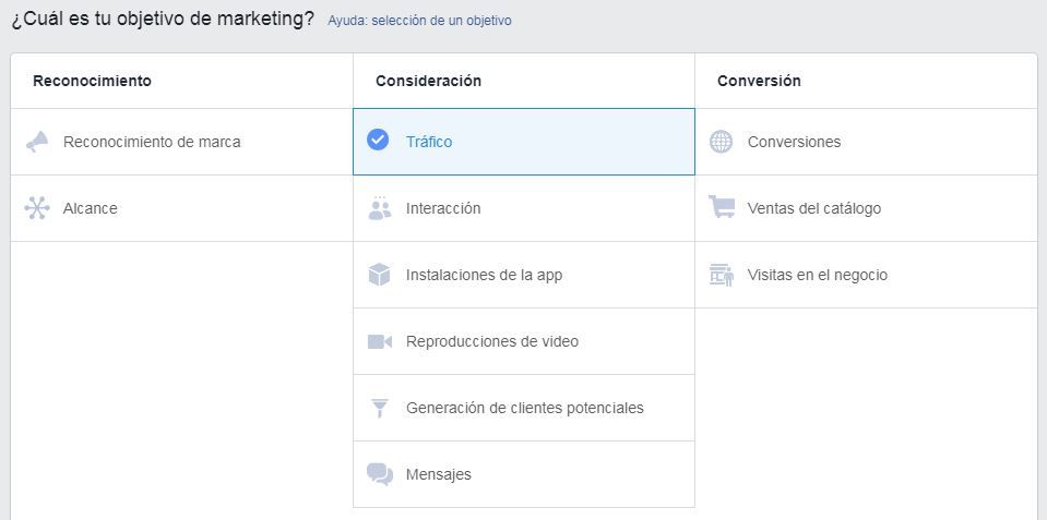 Una vez dentro, lo primero es seleccionar el Objetivo que persigues con tu campaña de en Facebook. Estos son todos los objetivos disponibles: