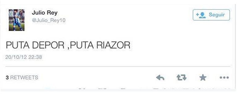 Y de un aficionado al fútbol pasamos a un futbolista . Julio Rey tenía solo 17 años en 2012. Con esa edad tan temprana es fácil entender que no pensara en las consecuencias de publicar un tuit insultando al Deportivo de La Coruña y seguro que muchos de vosotros le perdonaríais el desliz. No es el caso del club coruñés, que ha decidido no fichar al futbolista debido a este tuit..Sus razones son estas: "El Deportivo entiende que un jugador merece vestir la camiseta blanquiazul si es un ejemplo de deportividad, respeto por los rivales, compromiso y sentimiento positivo hacia el Dépor, sus colores, su escudo y los valores que la institución representa". ¿Qué os parece?