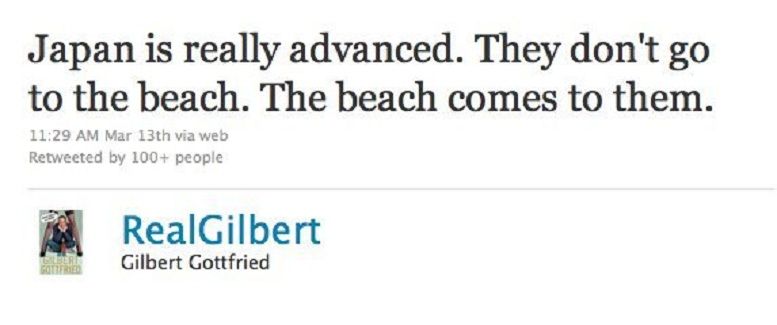 Y seguimos con el humor negro, esta vez de la mano del cómico Gilbert Gottfried. Se podría pensar que un profesional del humor sabría reconocer mejor donde están los límites antes de publicar un tuit polémico, pero no fue el caso. Para contextualizar su mensaje debemos volver atrás cuatro años y recordar el tsunami que azotó Japón en marzo de 2011. Más de 15000 personas perdieron la vida y los daños materiales fueron incalculables. ¿Y cuál fue el más que desafortunado tuit que hizo que Gilbert Gottfried perdiera su empleo? “Japón está muy avanzado, ellos no van a la playa, la playa viene a ellos”. Juzguen ustedes mismos.