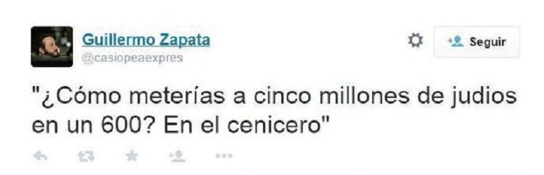 El caso más sonado recientemente en nuestro país. Guillermo Zapata es guionista, cortometrajista, novelista y también político. En las elecciones del pasado mayo se presentó formando parte del equipo de Ahora Madrid, liderado por Manuela Carmena, actual alcaldesa de Madrid. Pocas horas después de su toma de posesión como concejal de Cultura, estalló la bomba. Unos tuits escritos en clave humorística (humor negro, pero humor al fin y al cabo), con más de 4 años de antigüedad, fueron los protagonistas de esta polémica. En tan solo unas horas las capturas de estos tuits se extendieron rápidamente por las redes sociales y los medios de comunicación, siendo muchas las personas que pedían ya su dimisión. Como consecuencia de ello, Zapata renunció a la concejalía de Cultura, aunque permanece en el equipo municipal como concejal presidente de los distritos de Fuencarral-El Pardo y Villaverde. Un ejemplo claro de cómo el humor en redes sociales puede pasarte una mala jugada, llegando incluso a hacerte perder tu trabajo.