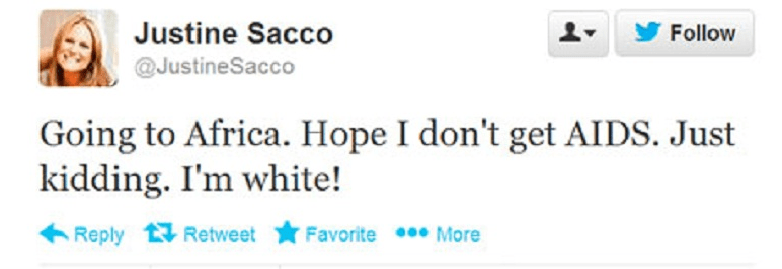Os mostramos un ejemplo de cómo perder tu trabajo y reputación y ganarte miles de enemigos en menos de 144 caracteres. Ya sabemos que el humor negro es muy subjetivo y polémico. Lo que para unos puede ser una broma para otros es un comentario hiriente y fuera de lugar. En el caso del tuit de Justine Sacco yo creo que , si su intención era hacer una broma, debió entenderla solo ella, pues ni con mis mejores gafas de “humor negro” consigo verle la gracia. Aunque como ya he dicho, es algo subjetivo. Justine Sacco era responsable de comunicación de un gran grupo tecnológico, y digo era porque perdió su trabajo a raíz de publicar un tuit racista antes de viajar a Sudáfrica. Su mensaje fue el siguiente: “Voy a África. Espero no pillar el SIDA. Es broma. Soy blanca”. Pese a que ella solo contaba con 170 seguidores, el tuit no tardó en hacerse viral, sobre todo después de que el escritor Sam Biddle lo retuiteara, llegando así a sus 15000 seguidores. La indignación prendió como la pólvora en Twitter, llegando incluso a crearse un hashtag #HasJustineLandedYet y un dominio JustineSacco.com con el objetivo de conseguir donaciones para la lucha contra el Sida. Está claro que no hay mal que por bien no venga, ¿no?