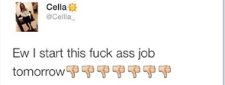 Si no tienes empleo, pero lo estás buscando, ten cuidado. Puedes perder tu trabajo incluso antes de empezar. Esto es precisamente lo que le ocurrió a una joven norteamericana el pasado junio. Tras conseguir un puesto en una pizzería, esta chica texana, en un alarde de madurez (nótese la ironía), no dudó en dedicarle unas “bonitas palabras” a su nuevo empleo mediante Twitter: “Ew I start this fuckass job tomorrow”. Poco tiempo después el dueño de la pizzería vio el tuit y no dudó en responderle por el mismo medio, despidiéndola en el acto a través de la misma red social. "No, no vas a comenzar ese jodido trabajo hoy. Te acabo de despedir. Buena suerte con tu vida sin dinero ni trabajo”. Estas fueron las palabras de su efímero jefe, Robert Waple. Lejos de mostrarse arrepentida o avergonzada, publicó otro mensaje en la red en el que se reía por haber sido despedida vía Twitter. Está claro que en este caso no debía de necesitar mucho el trabajo, pero igualmente podemos aprender una gran lección sobre qué debemos decir y qué no en las redes sobre la empresa para la que trabajamos o vamos a trabajar.