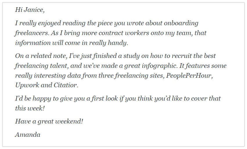 - Asegúrate de que tu propuesta sea relevante. Si estás promocionando un artículo relacionado con SEO, verifica que el sitio web haya publicado y enlazado previamente contenido relacionado con SEO. Si no lo han hecho, contacta a alguien más en su lugar.