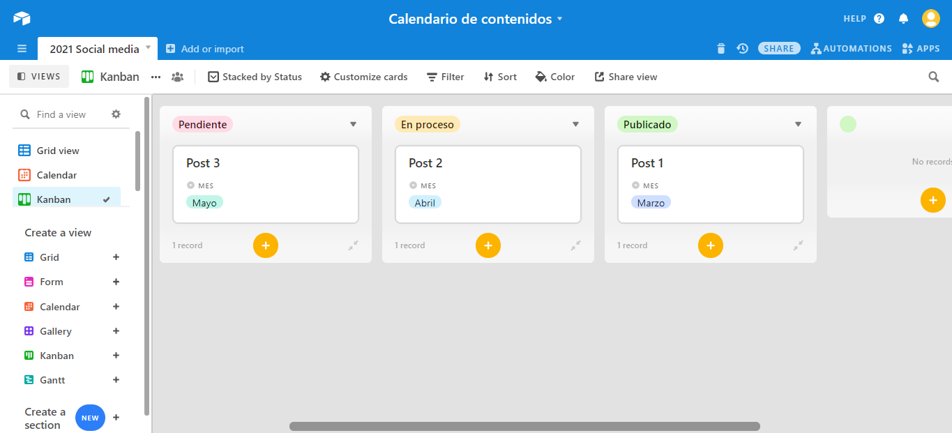 Airtable ofrece un calendario descargable que se lee como una simple hoja de cálculo y tiene campos personalizados para palabras clave específicas. Para algunas personas el diseño de la lista puede ser menos abrumadora que un tablero KanBan.