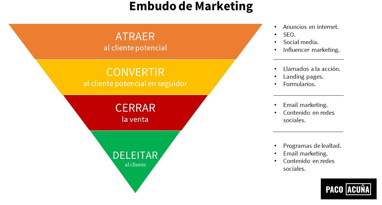 Estos tres pasos se corresponden en gran medida con el principio, medio y final del embudo de marketing, también llamado viaje del comprador. En otras palabras, cada pieza individual de contenido que publiques debe estar dirigida a fomentar el conocimiento de tu marca, conseguir nuevos clientes potenciales o fomentar las ventas.