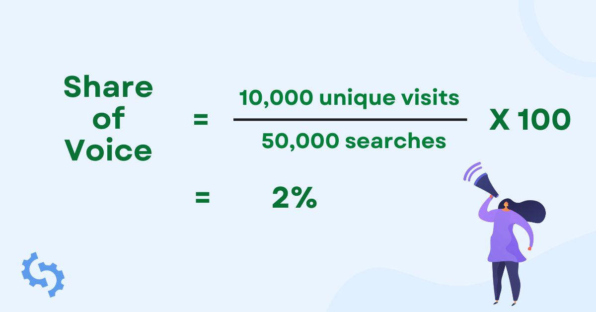 Por ejemplo, si el tráfico de búsqueda orgánica de una marca de comercio electrónico para la palabra clave “auriculares inalámbricos” es de 10,000 visitas y el tráfico total de búsqueda orgánica para esa palabra clave es de 50,000, entonces, la cuota de voz se calcula como (10,000 / 500,000) × 100 = 2%.