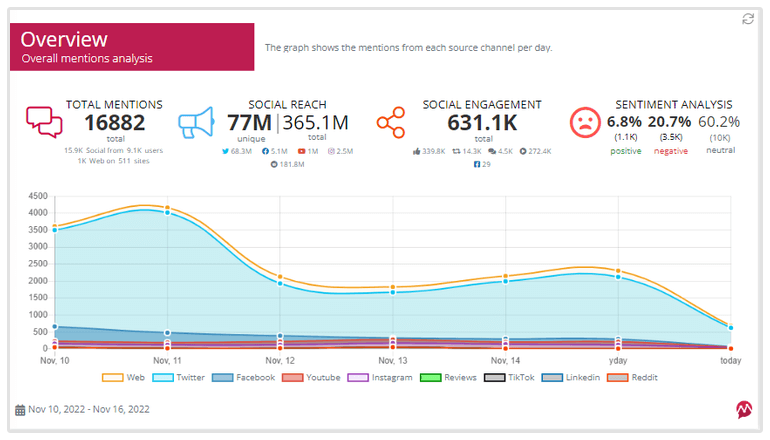 Aquí hay un ejemplo de un informe de mención de marca que muestra el total de menciones de marca, el alcance social, el compromiso social general y el análisis de sentimiento de la audiencia: