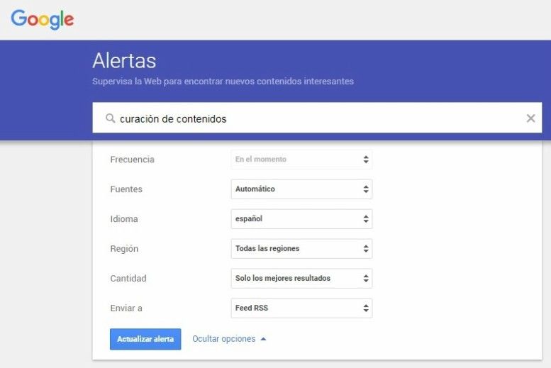 La creación de una alerta es sencilla. Se realiza introduciendo una cadena de búsqueda (por ejemplo, "curación de contenidos") y seleccionando una serie de parámetros: la Frecuencia con la que queremos recibir las alertas; las Fuentes sobre las que queremos buscar (blogs, webs, vídeos, foros, etc); el Idioma, etc.