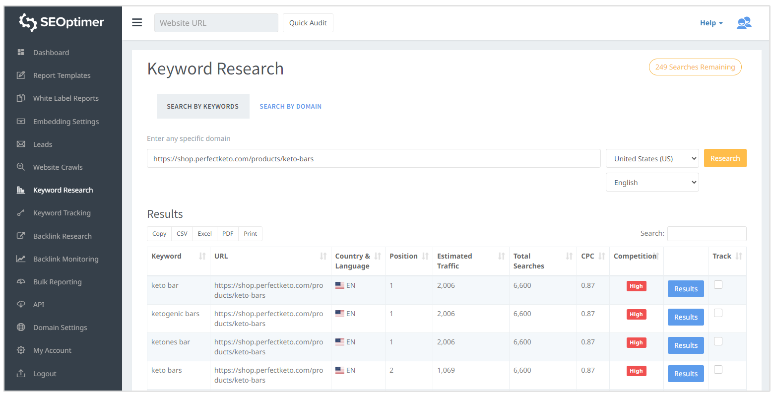 Y los resultados muestran que, actualmente esta página está clasificada en la primera posición para varias palabras clave de enfoque como “keto bar”, “ketogenic bars”, “keto bars”, etc.