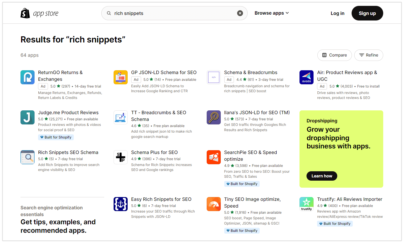 Por ejemplo, la tienda de aplicaciones de Shopify muestra más de 60 aplicaciones si buscas “rich snippets”, así que podrás encontrar fácilmente un plugin relevante si es necesario.