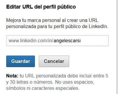 El perfil de LinkedIn de cada uno de nosotros está asociado a una URL única. Por defecto es nuestro nombre+letras y números. Puedes editarla en la zona de ajustes y privacidad➜Privacidad➜edita tu perfil público. Puedes poner solo tu nombre y apellidos o lo que quieras siempre que ocupe menos de 30 caracteres: