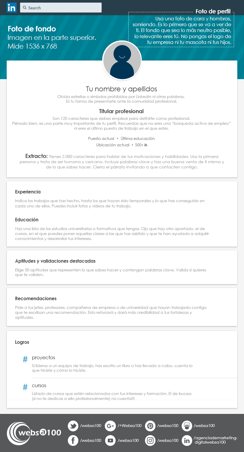 El "gran peso" del perfil LinkedIn recae sobre la parte superior, en un área rectangular se concentra información muy importante. Para mí "te la juegas" en este espacio: si tu perfil no es atractivo puedes perder muchas oportunidades. Así que cuida todos estos elementos: