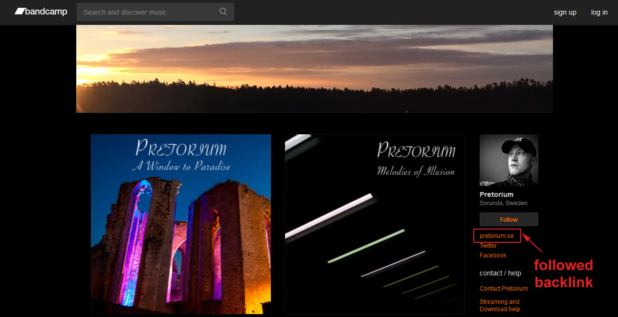 El ejemplo a continuación muestra un enlace de retroceso seguido para la banda sueca Pretorium en Bandcamp: