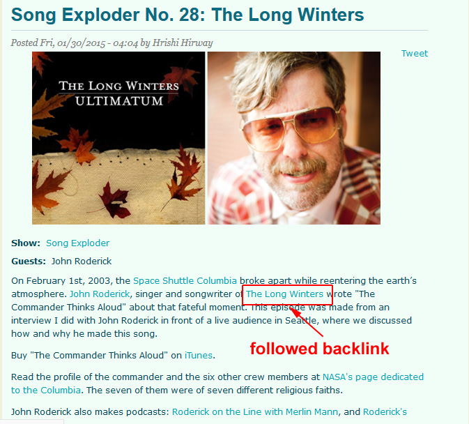 Bandcamp ofrece un enlace seguido a los músicos, pero en otros sitios web este backlink podría ser no seguido (con una etiqueta rel=nofollow adjunta), o no estar allí en absoluto. Por ejemplo, Last.fm ofrece un backlink nofollow, SoundCloud utiliza una redirección y iTunes no ofrece ningún backlink en absoluto.