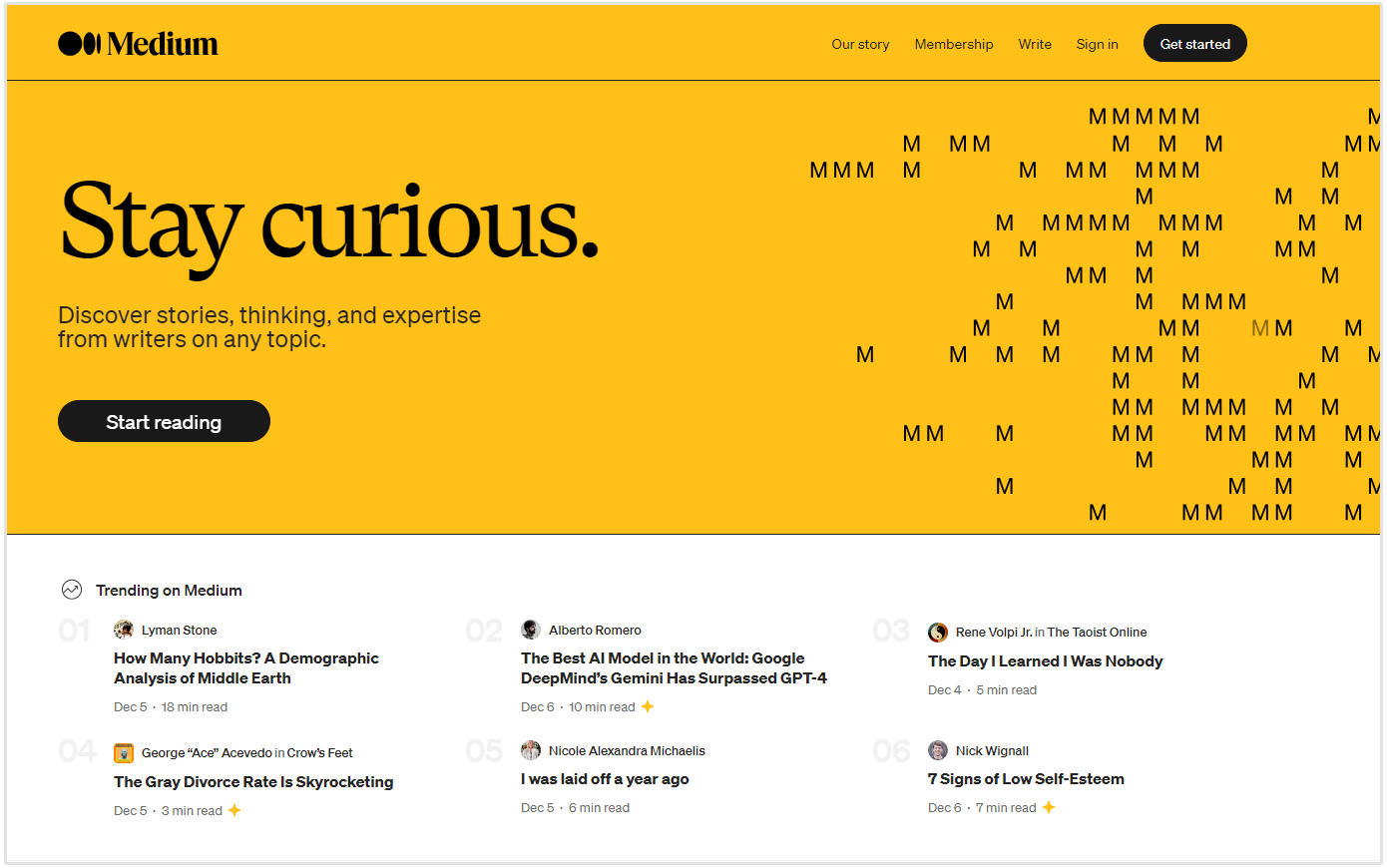 Medium es un tipo de plataforma de blogs para narración de historias y escritura empresarial que también te permite seguir a tus escritores favoritos.