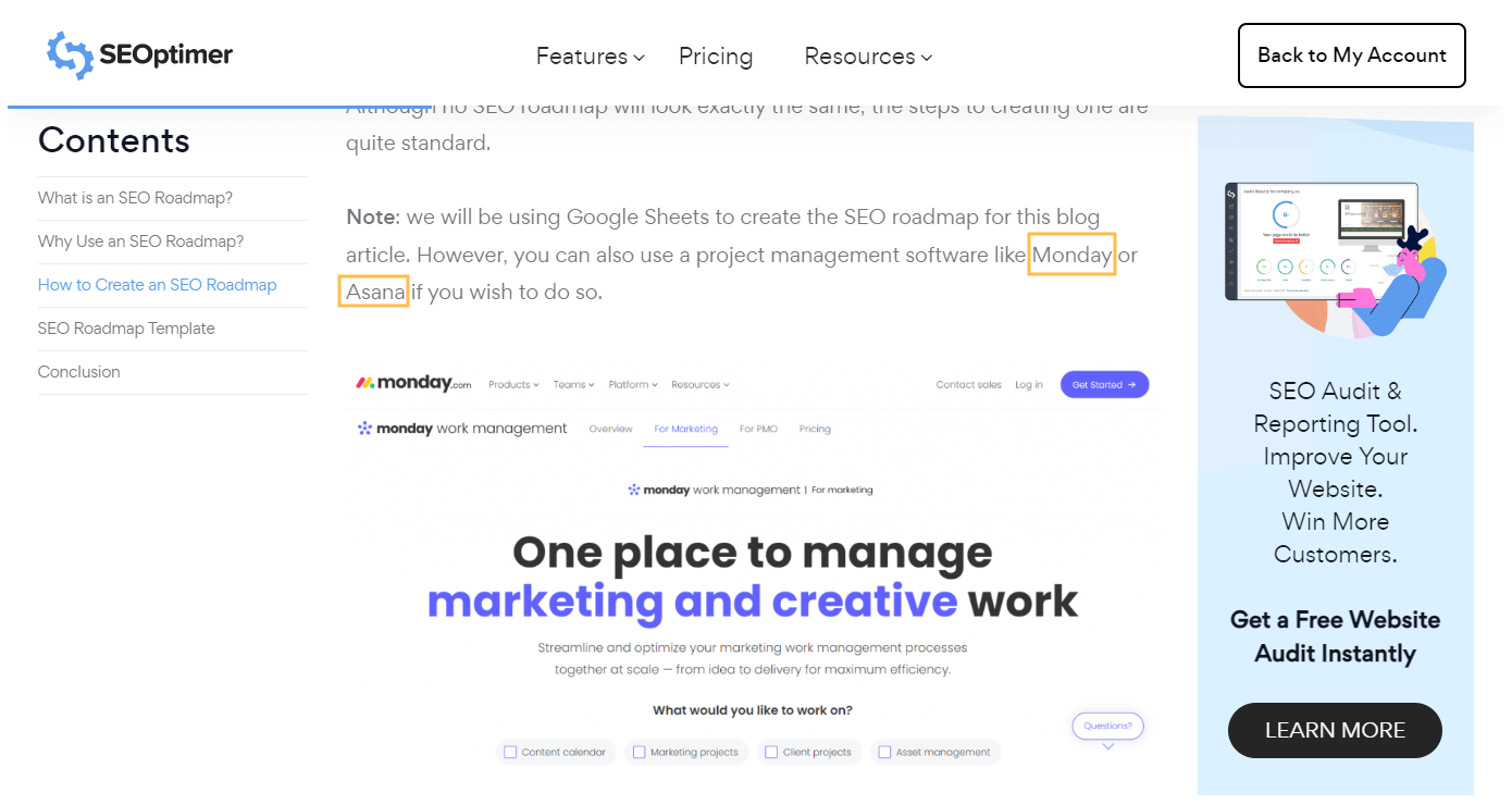 Por ejemplo, aquí hay un artículo en el blog de SEOptimer mencionando Monday y Asana. Ten en cuenta que no enlazamos a estas marcas con un enlace externo a sus sitios web, por lo que estos son ejemplos de enlaces implícitos.