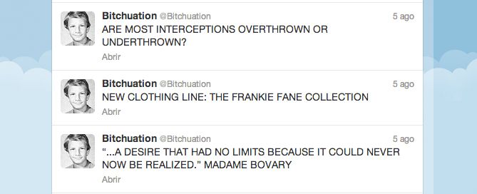El realizador, desde luego, ha decidido echar una partida de “Tuiteratura”. Además, algunas editoriales también juguetean con Twitter y publican sus avances editoriales en formato tuit y numerosos artistas se han lanzado a una carrera loca por publicar tuits dignos de apalancarse en una pared del Museo de Arte Moderno (Moma) de Nueva York. Quizás, ¿verdad? Hagan paso al tiempo.