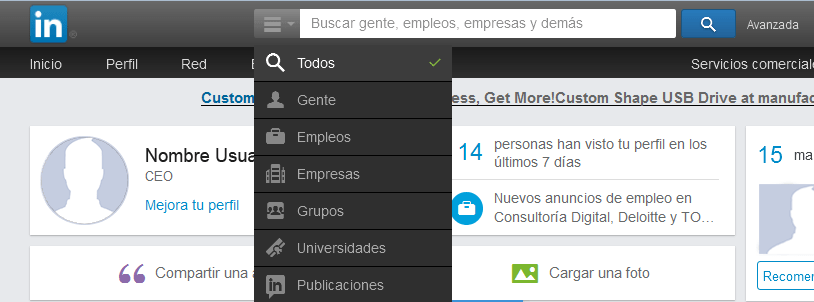 Un tip extra sobre las páginas de empresa. Si quieres saber qué empresas tienes entre tus contactos de primer grado haz este truco: Ve al buscador de la parte superior y selecciona empresas: