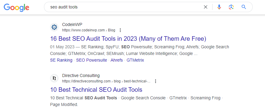 Uno de los resultados puede proporcionar una lista de herramientas de software que ofrecen servicios de “auditoría SEO” y el otro una lista de artículos que presentan las mejores herramientas de auditoría SEO que puedes utilizar.
