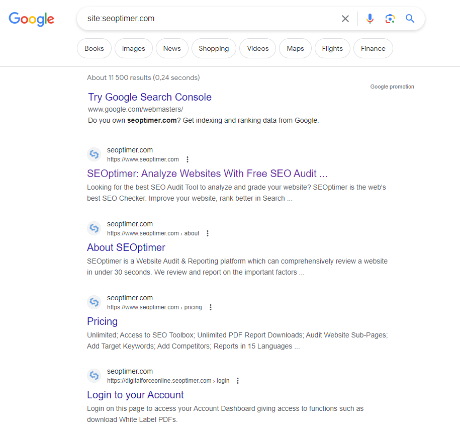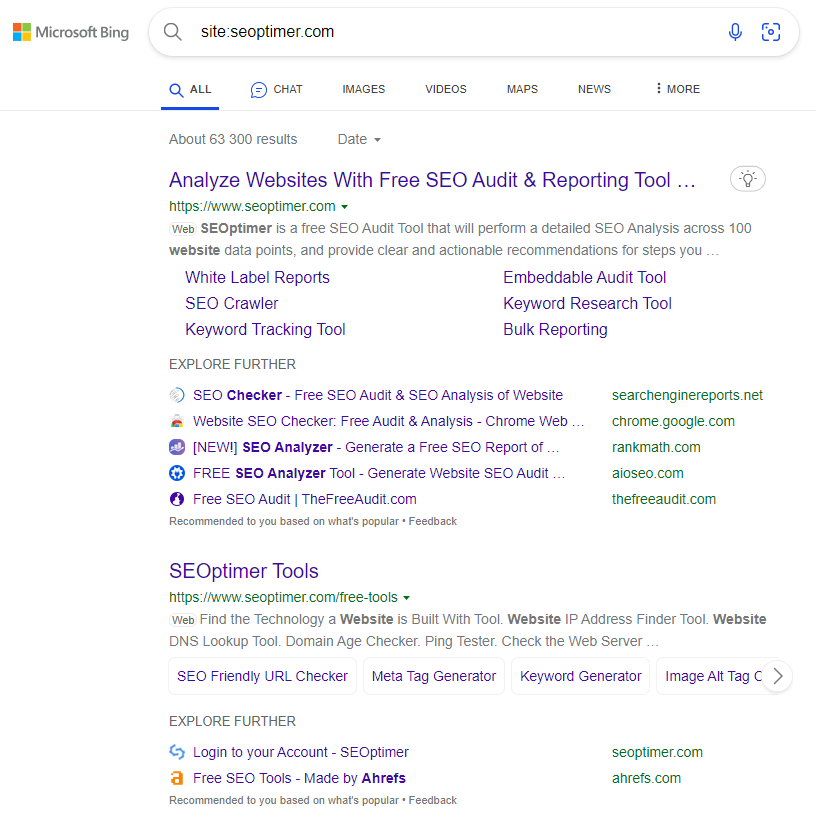 Puedes escribir “site:www.yoursite.com” en Google o Bing y ver cada página que ha sido indexada. Asegúrate de no insertar un espacio entre “site:” y “www.yoursite.com”.
