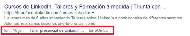Cada vez existen más tipos de datos estructurados, y si quieres pelear por la primera posición debes sumarte a esta nueva ola, o estarás perdiendo visibilidad y visitantes a tu página web. Aquí tienes un ejemplo de datos estructurados para eventos, que ocupa el primer resultado para “talleres linkedin”: