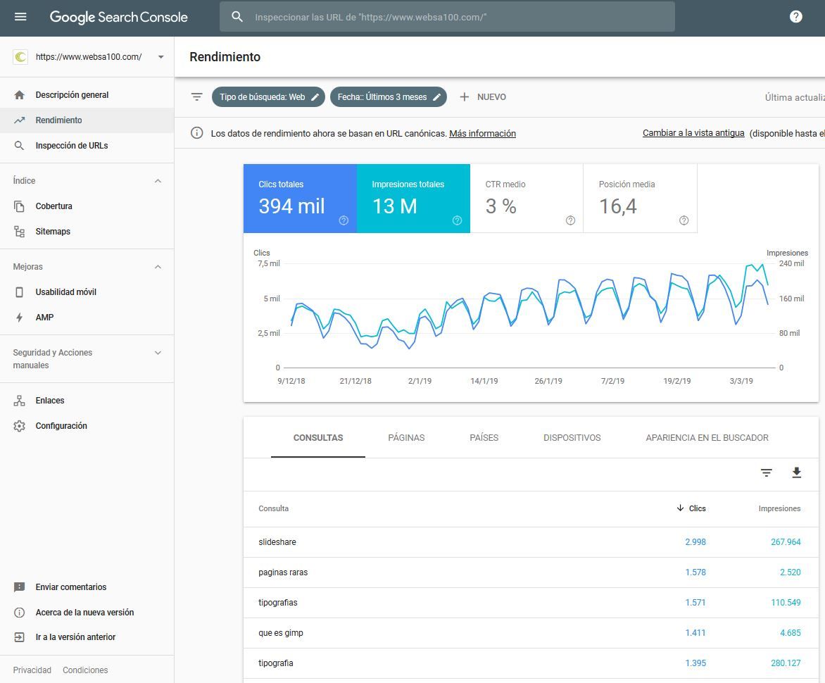 - Impresiones totales: representa el número de veces que apareció tu web en dichas búsquedas.