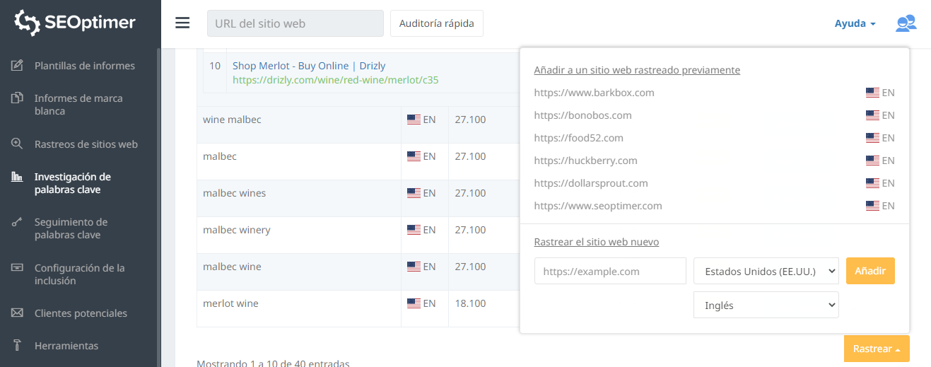 En el siguiente ejemplo buscamos varias palabras clave en los Estados Unidos. Los resultados muestran un mayor volumen de búsqueda mensual en los términos o términos relacionados que utilizan la misma palabra clave. Por ejemplo, una de las palabras clave que buscamos fue "malbec" con 27,100 búsquedas mensuales; mientras que el término "merlot" mostró 40,500 búsquedas mensuales: