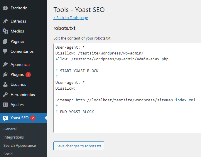 En WordPress, si el archivo robots.txt es parte de tu sitio, usa el Plugin Yoast para editarlo. Si el archivo robots.txt que está provocando problemas está en otro sitio que no es el tuyo, debes ponerte en contacto con los propietarios del sitio para pedirles que editen su archivo robots.txt.