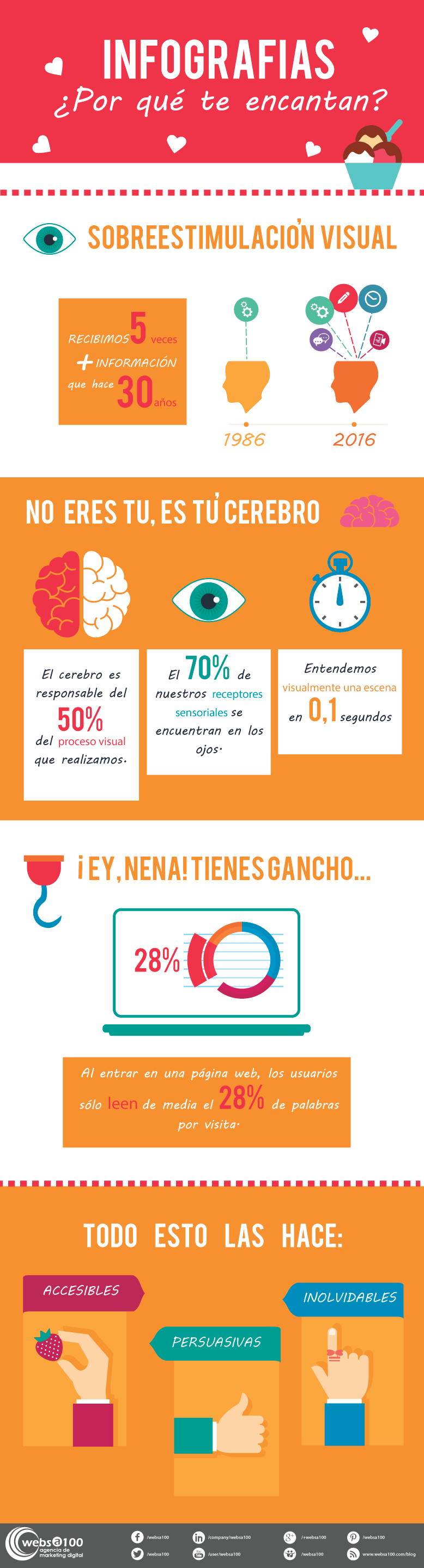En websa100 nos enloquecen las infografías, lo habrás notado, las usamos para transmitir la mayoría de la información, nos gustan porque transmiten muchos datos de una forma amena y sencilla. Hay algo mágico en ellas, por eso nos hemos preguntado ¿qué las hace tan fascinantes? A continuación te explicamos la ciencia detrás de ese amor que sientes por las infografías.