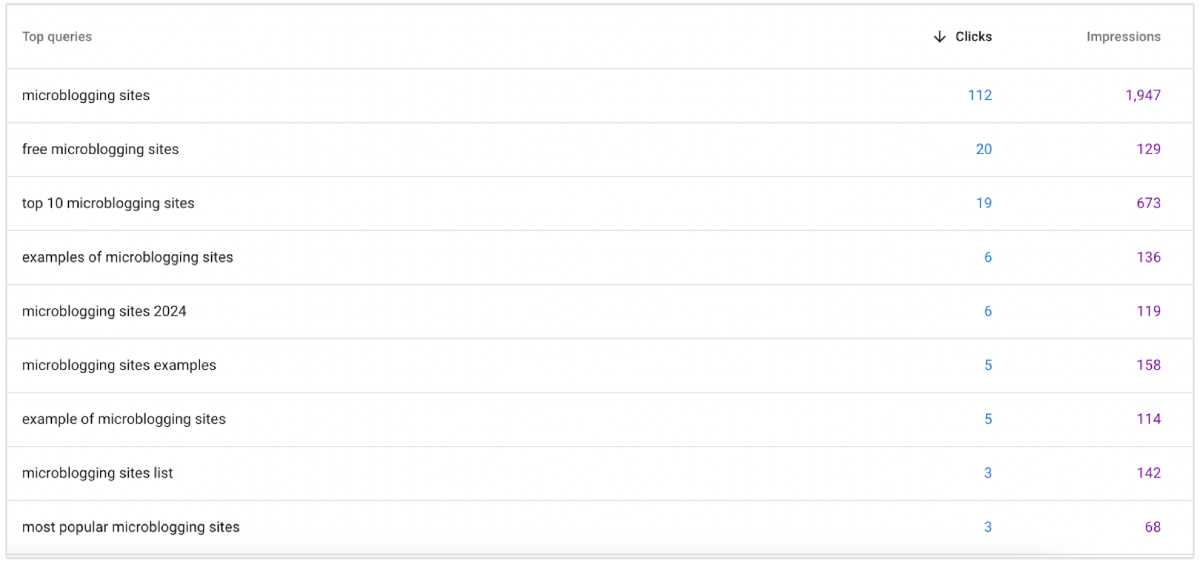 Por ejemplo, deseo averiguar las clasificaciones de palabras clave para la palabra clave semilla ‘sitios de microblogging,’ así que ingresaré esta palabra clave en el cuadro de consulta y haré clic en Aplicar. Ahora, puedo ver todos los términos de búsqueda relacionados con mi palabra clave principal en los que mi sitio se clasifica junto con impresiones y clics.