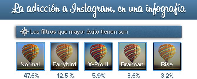 Más de 50 millones de usuarios ya usan esta red social y cinco millones de fotografías se suben cada día. Los filtros, clave del éxito de esta red, más utilizados son: Normal, EarlyBird y X-Pro II. ¿Y los usuarios que sufren esta adicción a Instagram, interaccionan mucho? Pues los datos demuestran que sí, ya que la red social registra más de 575 "me gusta" al segundo. El el mismo espacio de tiempo se realizan 81 comentarios y se suben 26 fotografías. Instagram es conocida también por su uso de los hashtags. De hecho, aunque Twitter fue la pionera en el uso de estas etiquetas, cada vez se relacionan más con Instagram, otro ejemplo de esta ola de adicción a Intagram que sufren los usuarios de redes sociales. Entre todas las etiquetas que se usan cada día en la red social, las más habituales son: #love, #me, #instagood y #follow. Para optimizar el uso de los hashtags en esta red social existen diversas herramientas, como Iconesquare.