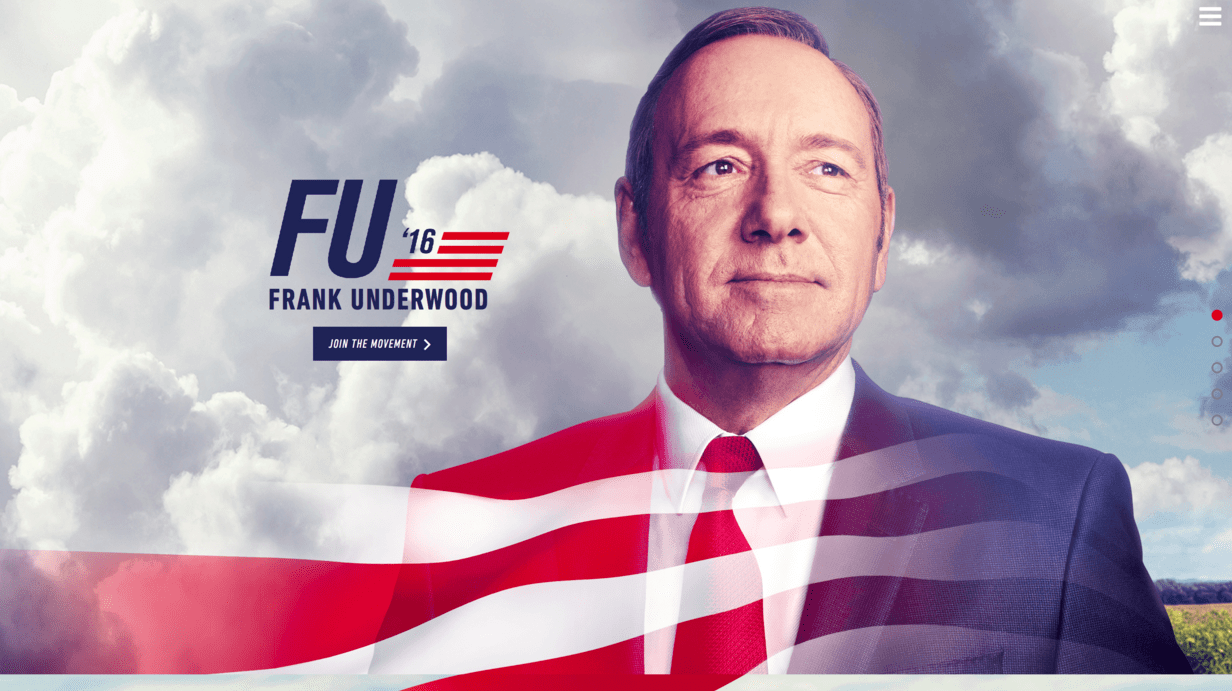 Con las elecciones a la presidencia de EEUU a la vuelta de la esquina. La Agencia de publicidad BBH vio una oportunidad para insertar la serie de Netflix “House of Cards” en la conversación mediática por la pugna de la presidencia. Este anuncio tomó al protagonista principal, Frank Underwood y se propuso como candidato presidencial.