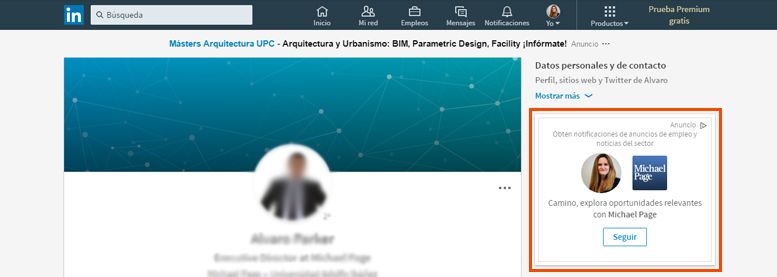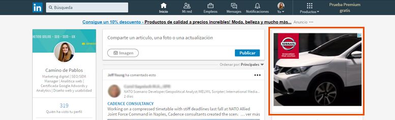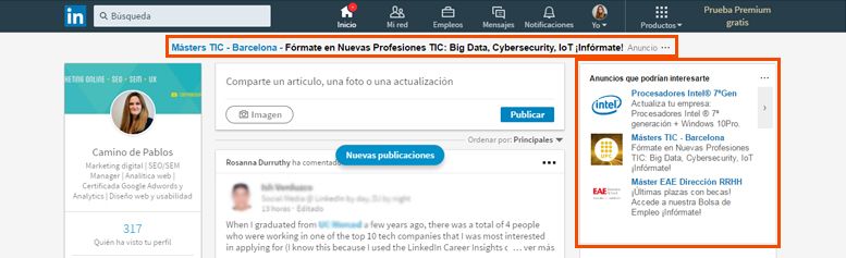 Como vemos en la imagen, los anuncios de texto son los que LinkedIn te enseña en la parte derecha de su página principal bajo en apartado de "Anuncios que podrían interesarte" y el que aparece justo encima. Son, de nuevo en mi más sincera opinión, prácticamente invisibles y pueden pasar desapercibidos muy fácilmente.