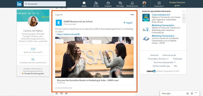 Este tipo de publicidad en LinkedIn es mucho más parecido a lo que estamos acostumbrados a ver en otras redes sociales como Facebook. Se trata de actualizaciones en el muro con el indicativo de "promocionado".