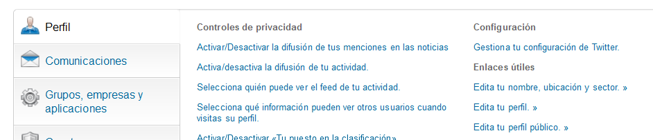 Dónde hacerlo: ve de nuevo a tu foto en pequeño de la esquina superior derecha del menú de LinkedIn (¿no te decía yo que esta red era compleja? Ya vas viendo por qué...), pulsa sobre "privacidad y configuración" y verás un menú como éste: